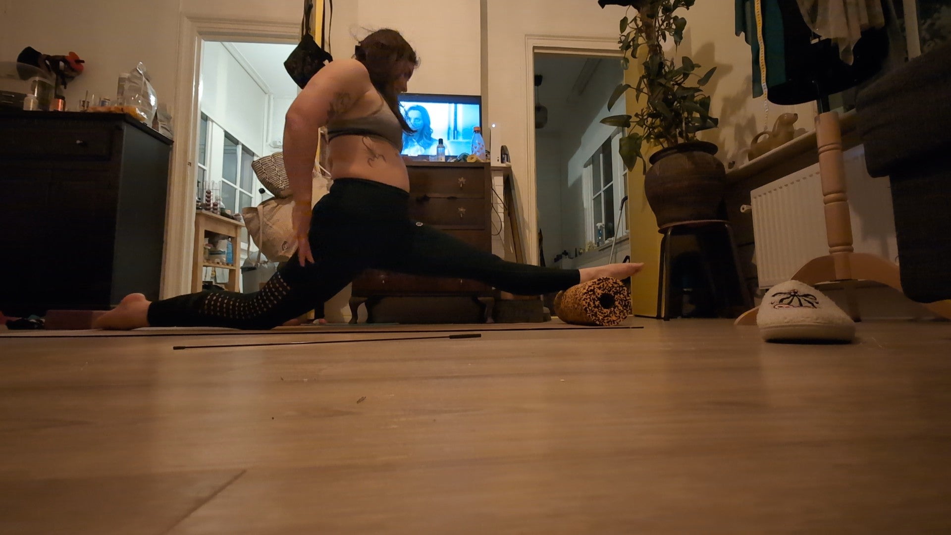 Also added some foam roller assisted splits. This is the challenging side. I like to use the foam roller because the distance between the floor gives me more space to square